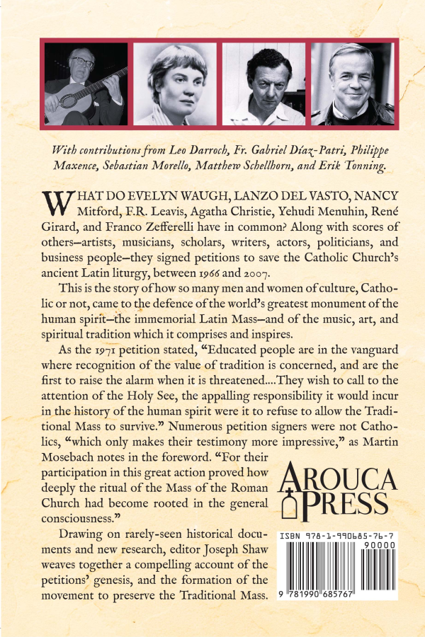 What do Evelyn Waugh, Lanzo Del Vasto, Nancy Mitford, F.R. Leavis, Agatha Christie, Yehudi Menuhin, René Girard, Franco Zefferelli, Stephen Hough, and Prof Jonathan Riley-Smith have in common? Along with scores of others—artists, musicians, scholars, writers, actors, politicians, business people, and others—they signed public petitions to save the Catholic Church’s ancient Latin liturgy, between 1966 and 2007. This is the story of how so many men and women of culture, some Catholic, many not, came to the defence of the world’s greatest monument to the human spirit—the immemorial Latin Mass—and of the music, art, and spiritual tradition which it comprises and inspires. As the 1971 petition stated, “Educated people are in the vanguard where recognition of the value of tradition in concerned, and are the first to raise the alarm when it is threatened.…They wish to call to the attention of the Holy See, the appalling responsibility it would incur in the history of the human spirit were it to refuse to allow the Traditional Mass to survive.” Numerous petition signers were not Catholics, “which only makes their testimony more impressive,” as Martin Mosebach notes in the foreword. “For their participation in this great action proved how deeply the ritual of the Mass of the Roman Church had become rooted in the general consciousness.” Drawing on rarely seen historical documents and new research, this book weaves together not only a record of the petitions, but a compelling account of their intellectual and cultural genesis, and the formation of the movement to preserve the Traditional Mass. Ultimately, the question at hand is one of spiritual sensitivity. As Vladimir Ashkenazy, an acclaimed pianist and conductor, put it: “The ancient liturgies, be they Catholic or Orthodox…are, by default, bound to represent a much purer spiritual relationship with Christ in particular, and with the world in general.”
